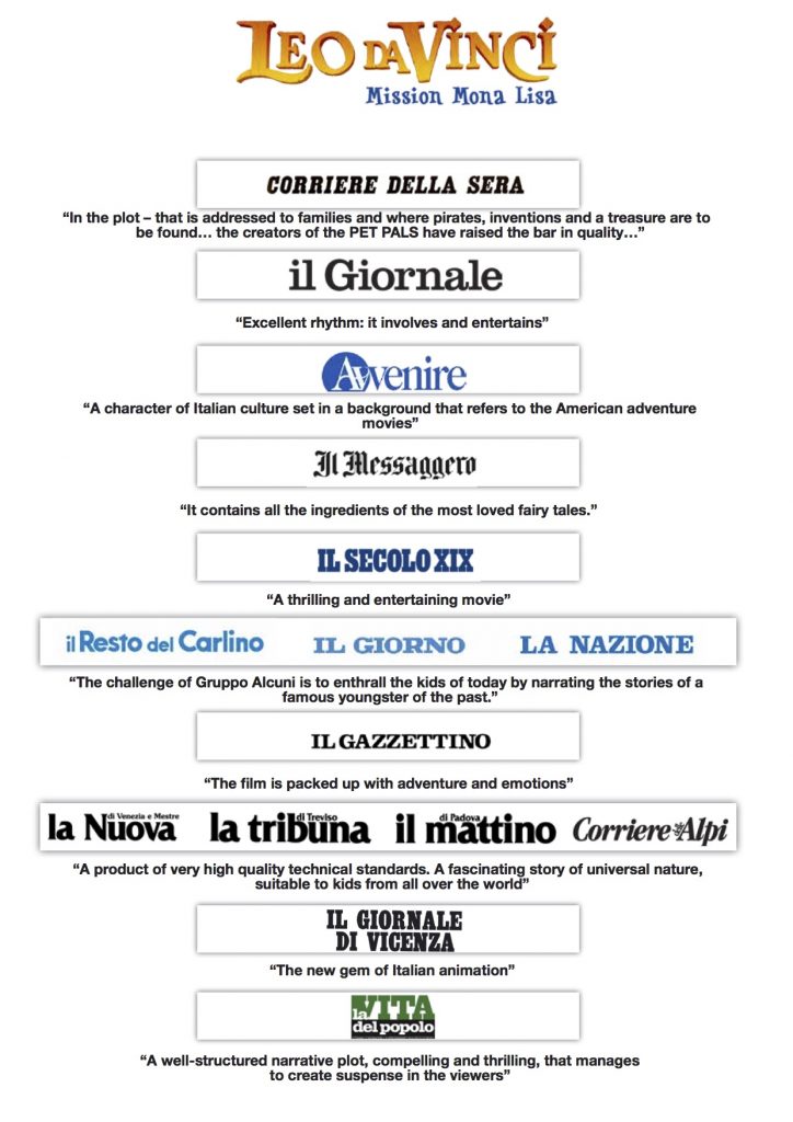 Movieplayer.it: “The protagonist of Leo Da Vinci – Mission Mona Lisa is a character with whom kids are brought to empathize immediately. The operation of Manfio is perfectly successful, because it introduces Leonardo da Vinci with the right style – combining tradition and modernity – to the younger audiences.”